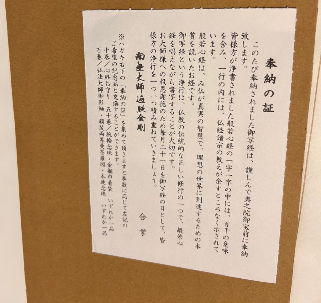 この写経は、和歌山県 高野山の金剛峯寺に、(1枚 1000円) で奉納します。