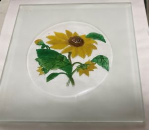 springroadのHALと申します。ガラスのコースターをご紹介したします。 これはガラスを彫刻して色を入れております。 サイズは12cm×12cm×5mmです。 (Springroad)